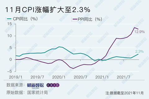 国家统计局12月9日公布的数据显示,11月PPI同比增长12.9%,较10月小幅回落0.6个百分点,但仍为有数据以来次高;CPI同比增长2.3%,高于10月0.7个百分点,延续了10月的反弹趋势。扣除食品和能源价格的核心CPI同比增长1.2%,较10月回落0.1个百分点。